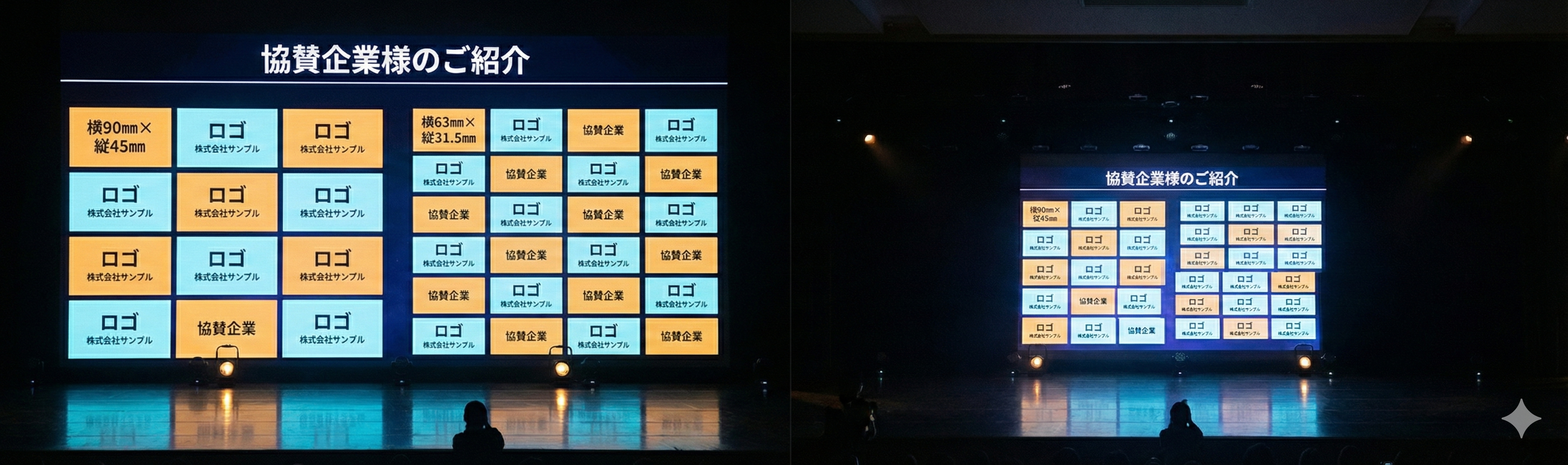 ②大型スクリーン投影:舞台上のスクリーンにロゴや企業名を表示